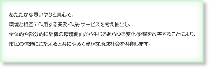 - 当社の生産活動、並びにサイトの事業活動全般が環境に与える影響を評価し、環境保全に努める。このためEMSの効果的運用を図り、継続的改善及び汚染の予防に尽力する。