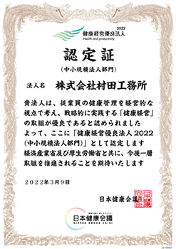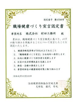 全国健康保険協会宮城支部へ「職場健康づくり」宣言し、2018年12月10日に認定書をいただきました。