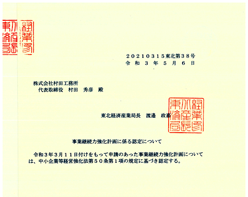 令和3年5月6日付 東北経済産業局より事業継続力強化計画に係る認定を受けました。